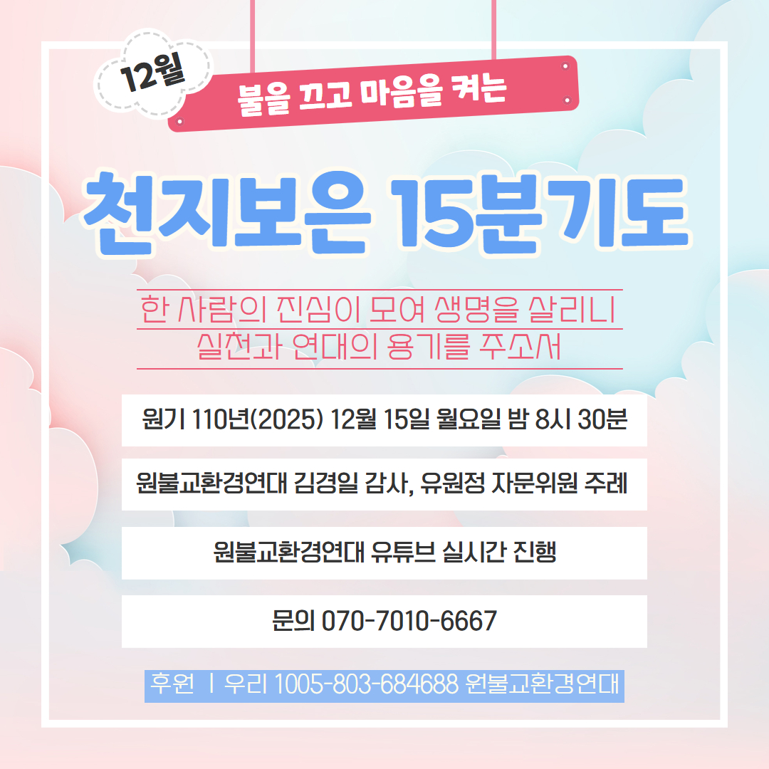 올해 천지보은15분 중에는 주례자들이 직접 마음을 담은 기도 한 대목과 이 달의 환경기념일을 소개하는 기후 브리핑 시간을 가졌습니다. 매달 새로운 다짐과 배움, 성찰이 시간이 되셨기를 바랍니다.^^ 12월 기도는 한결같이 원불교환경연대를 지지하고 활력을 불어넣어주시는 김경일 감사님과 유원정 자문위원님을 모셨습니다. 생명을 품고 터전이 되는 흙이 건강해야 우리도 건강하다는 당연한 진리를 되새기는, 12월 15일 천지보은15분기도에 함께해 주시기 바랍니다. 🙏🏻💚🌏