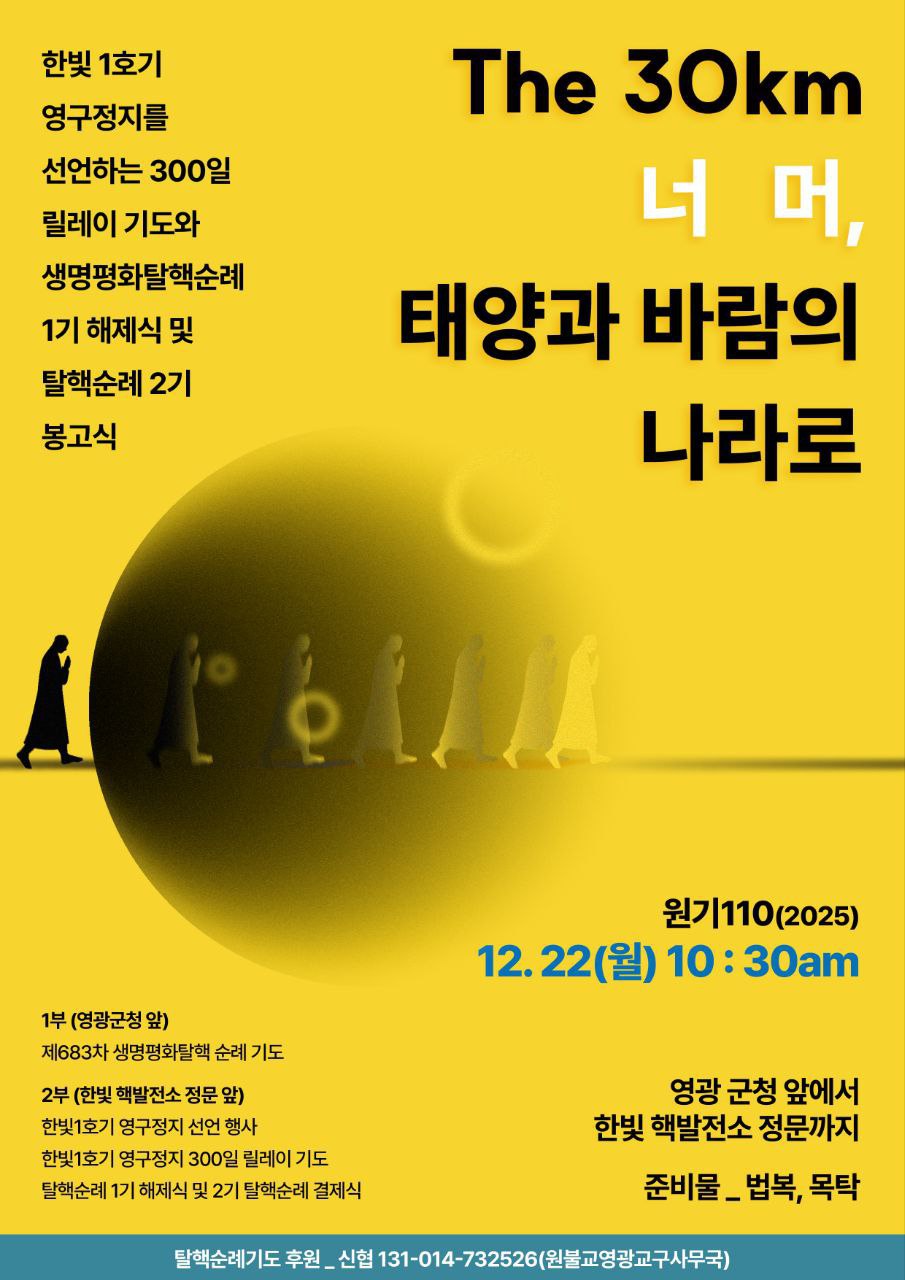 원불교를 비롯해 지역주민과 이웃종교인 전국의 시민들이 함께한 생명평화탈핵는 13년이 흘렀습니다. 6기의 발전소 중 설계 수명대로 40년 운전을 꼬박 채운 1호기가 2025년 12월 22일 월요일, 멈춰야 하는 날입니다. 운명처럼 이날은 683차 생명평화탈핵순례를 하는 날입니다. 올해 2월 25일부터 매일 한 사람씩, 300일의 '한빛 1호기 영구정지 릴레이 기도'에서의 간절한 마음을 담아 부디 안전히 한빛 1호기가 영구히 문닫을 수 있도록 큰 힘을 모으고자 합니다. 오직 모두를 살리고자 하는 마음을 담아 한빛 2호기가 멈추는 2026년 9월 11일까지 생명평화탈핵순례를 잘 이어가고자 하는 자리에 부디 많은 분들이 함께해주시길 바랍니다. 순례자 여러분의 기도가 큰 힘이 됩니다.